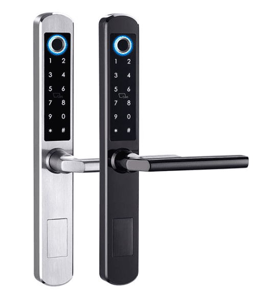 Tóg anGlas Doras Méarloirg Chliste caol — FM 210 mar shampla. Tacaíonn an táirge seo le rialú tríd an APP TUYA / TT Lock, le modhanna díghlasála lena n-áirítear méarloirg bithmhéadrach, cód, NFC, RF ID, agus eochracha meicniúla.
